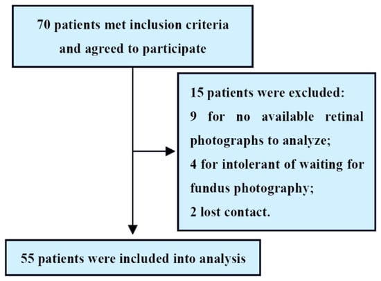 A total of 70 patients met the inclusion criteria. Of these, 15 patients were excluded because of a lack of available retinal photographs to analyze, intolerant of waiting for fundus photography or lost contact. Therefore, 55 patients with HF (mean age 65.6 ± 12.7 years; 79.9% men) were included in the final analysis (Figure 2).