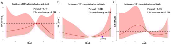 Association of retinal vessel caliber with risk for HF rehospitalization and mortality in HF patients. (A) for CRAE; (B) for CRVE, (C) for AVR. AVR, arteriolar-to-venular caliber ratio; CI, confidence interval; CRAE, central retinal arteriolar equivalent; CRVE, central retinal venular equivalent; HF, heart failure. HR, hazard ratio.