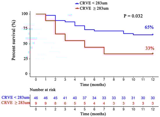 The Kaplan–Meier survival curves according to subgroups divided by CRVE (CRVE ≥ 283 μm and CRVE < 283 μm). CRVE, central retinal venular equivalent.