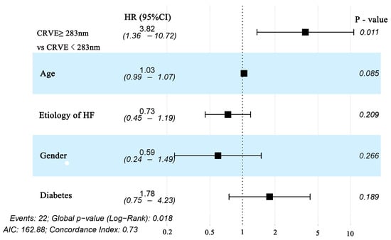 Forest plot of subgroups divided by CRVE (CRVE ≥ 283 μm and CRVE < 283 μm) for Cox regression with multivariable adjustment for age, sex, etiology of HF, and diabetes for the prediction of the primary endpoint (HF rehospitalization and mortality at 12-month follow-up) in patients with heart failure. CRVE, central retinal venular equivalent; HF, heart failure.