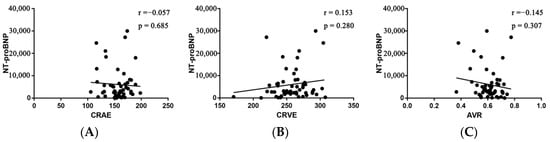 Pearson’s correlation between NT-proBNP and CRAE (A), CRVE (B), and AVR (C). AVR, arteriolar-to-venular caliber ratio; CRAE, central retinal arteriolar equivalent; CRVE, central retinal venular equivalent; NT-proBNP, N-terminal probrain natriuretic peptide.