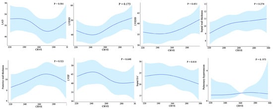 Furthermore, widening CRVE was not associated with cardiac structural characteristics such as left atria dimensions, left ventricular end-diastolic dimensions, left ventricular end-systolic dimensions, septal wall thickness, and posterior wall thickness and cardiac structural characteristics such as left ventricular ejection fraction, septal E/e’, and pulmonary arterial hypertension (Figure 7).