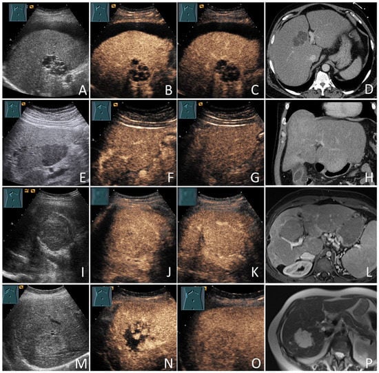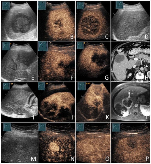 Malignant focal liver lesions (mFLLs) in patients with liver cirrhosis (LC). Lymphoma (the biopsy showed diffused large B-cell lymphoma) (A–D): large hypoechoic FLL on grey-scale ultrasound (A); large hypoechoic FLL with inhomogeneous enhancement on the arterial phase (B); large hypoechoic FLL with marked washout in the delayed venous phase (C); the sonographic follow-up image with the near total resolution of the lesions after chemotherapy (D). Metastases (the biopsy showed an adenocarcinoma and the primary tumor was unknown (CUP)) (E–H): hypoechoic FLL on grey-scale ultrasound (E); hypoechoic FLL with inhomogeneous peripheral isoenhancement on the arterial phase (F); hypoechoic FLL with early washout within 2 min (G); the corresponding CT of the FLL (courtesy of Prof. Dr. Andreas H. Mahnken, Department of Radiology, University Hospital Marburg) (H). Cholangiocarcinoma (the biopsy showed an intrahepatic cholangiocarcinoma) (I–L): large lobulated hypoechoic lesion on grey-scale ultrasound (I); large lobulated hypoechoic lesion with inhomogeneous peripheral enhancement after 20 s (J) and 60 s (K); the corresponding MRI of the FLL (courtesy of Prof. Dr. Andreas H. Mahnken, Department of Radiology, University Hospital Marburg) (L). Hepatocellular carcinomas (the lesions were proved to be moderately differentiated HCC on the histology) (M–P): small echogenic lesion on grey-scale ultrasound (M); small echogenic lesion with an early arterial phase hyperenhancement after 12 s (N) small echogenic lesion with isoenhancement after 40 s (O); small echogenic lesion washout after 3 min (P).