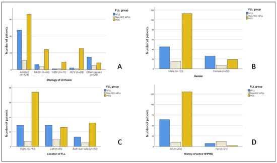 The differences in the etiological distribution of the three major FLL groups (bFLLs and HCC and non-HCC mFLLs) among the 225 study subjects, according to the etiology of cirrhosis (A), gender (B), lobar distribution (C), and history of active non-hepatic primary malignant disease (NHPMD) (D). FLL, focal liver lesion; bFLL, benign focal liver lesion; mFLL, malignant focal liver lesion; HCC, hepatocellular carcinoma.