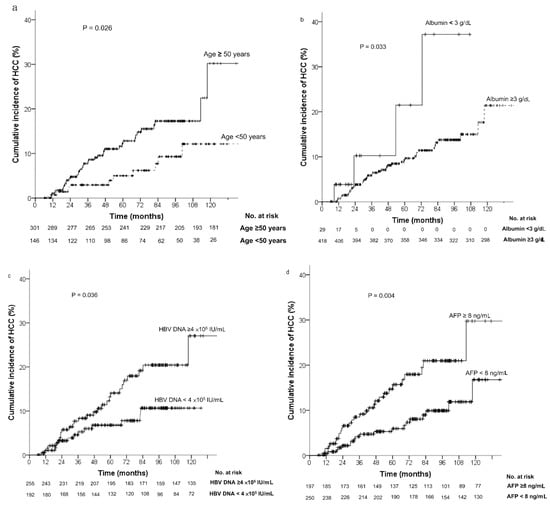 Factors associated with the risk of HCC development were assessed using the Kaplan–Meier method and compared using the log-rank test (Figure 1). Patients with HCC development during NUC therapy were significantly older (age ≥50 years) (p = 0.026), had higher pretreatment serum HBV DNA levels (≥4 × 105 IU/mL) (p = 0.036) and AFP levels (≥8 ng/mL) (p = 0.004), and had lower albumin levels (<3 g/dL) (p = 0.033). However, different NUCs did not affect the risk of HCC development.