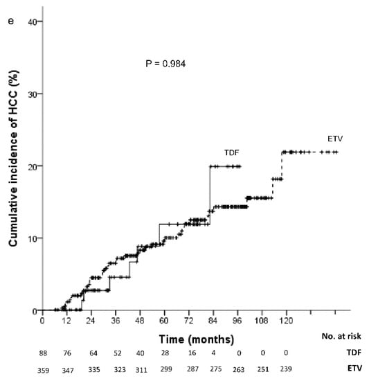 - Papatheodoridis, G.V.; Dalekos, G.N.; Idilman, R.; Sypsa, V.; Van Boemmel, F.; Buti, M.; Calleja, J.L.; Goulis, J.; Manolakopoulos, S.; Loglio, A.; et al. Similar risk of hepatocellular carcinoma during long-term entecavir or tenofovir therapy in Caucasian patients with chronic hepatitis B. J. Hepatol. 2020, 73, 1037–1045. [Google Scholar] [CrossRef]