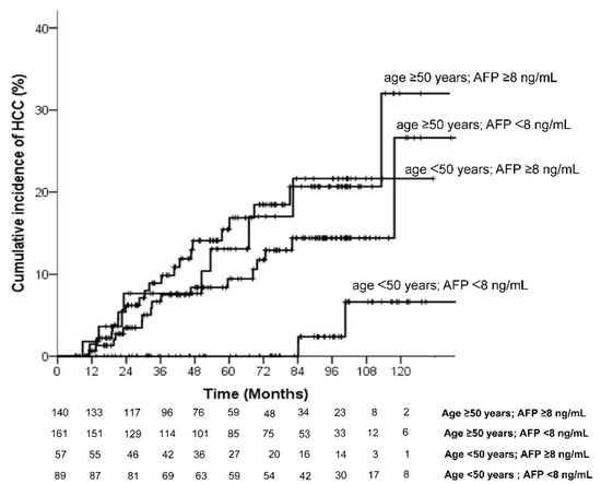The analysis of the incidence rate of HCC development was then stratified into subgroups according to the risk factors identified by the multivariate analysis (Table 3). As compared to the patients with treatment age <50 years and AFP <8 ng/mL (0.36, 95% CI = 0.06–1.19), the incidence rates of HCC per 100 person-years were significantly higher in patients with age ≥50 years and AFP ≥8 ng/mL (3.14, 95% CI = 1.99–4.72), p = 0.004. The patients with age ≥50 years and AFP ≥8 ng/mL had an 8.67-fold higher rate of HCC than those with age <50 years and AFP <8 ng/mL. Among patients with either age ≥50 years or AFP ≥8 ng/mL, the incidence rates of HCC were also higher than those with age <50 years and AFP <8 ng/mL. The cumulative HCC incidence differed significantly in patients with age <50 years and AFP <8 ng/mL versus age ≥50 years and AFP ≥8 ng/mL. As shown in Figure 2, the 5-year and 10-year cumulative incidence of HCC development were 0% and 6.6%, respectively, in patients with age <50 years and AFP <8 ng/mL; and 15.4% and 32%, respectively, in patients with age ≥50 years and AFP ≥8 ng/mL.