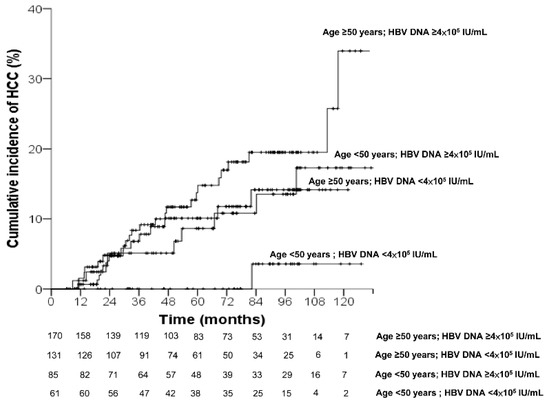 Cumulative incidence of hepatocellular carcinoma according to age and HBV DNA.