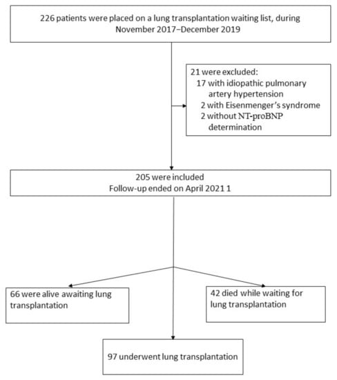 The study was designed as a retrospective investigation of patients treated at Rabin Medical Center, the national center for lung transplantation in Israel since 1997. The study was carried out in accordance with the Declaration of Helsinki and was approved by the institutional Ethics Committee. Figure 1 illustrates the study design. We identified 226 patients who were placed on a lung transplantation waiting list during the period November 2017–December 2019. After exclusion of 17 patients with class 1 PH, 2 patients with Eisenmenger’s syndrome, and 2 patients without available NT-proBNP measurement, 205 patients were included in the cohort. According to international guidelines for lung transplantation [], waitlisting for transplant required preserved left ventricular ejection fraction and no evidence of significant structural left heart disorder on echocardiographic examination. For analysis of demographic, clinical, LFT, RHC, and all-cause mortality data, the patients were stratified into the following three groups: (1) patients who underwent transplantation; (2) survivors waiting transplantation; (3) patients who died waiting for transplantation.