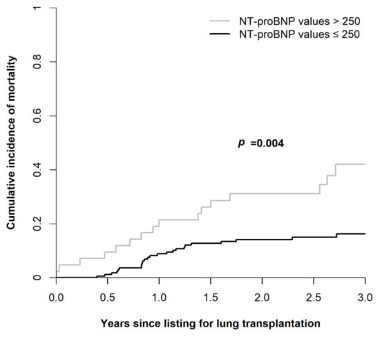 Figure 3 illustrates survival curves for waitlisted lung transplant candidates stratified by NT-proBNP levels, according to the Fine and Gray model. Among patients with NT-proBNP levels > 250 compared to ≤250 pg/mL, 1 year (51.2% vs. 39.0%), 2 year (74.4% vs. 68.3%), and 3 year (90.7% vs. 82.9%) mortality rates were significantly higher (p = 0.004).