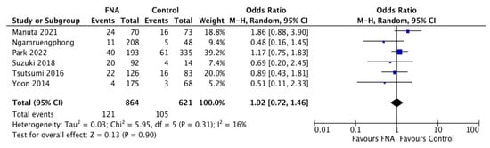 Forest plot comparing EUS-guided tissue acquisition versus non-sampling in terms of metachronous peritoneal dissemination. No difference in terms of metachronous peritoneal dissemination was observed between the two groups (OR 1.02, 0.72–1.46; p = 0.31), with evidence of low heterogeneity (I2 = 16%).