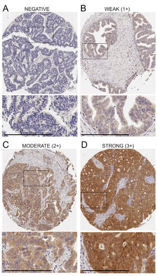 The staining intensity that we observed for anti-ADAM17 antibody was variable across the cohort and the staining pattern was cytoplasmic and mainly localized in the tumor cells, whereas the stroma was negative (all the staining is provided in Supplementary Figure S2). Cores from normal fallopian tubes, seeded in our TMAs as controls, showed a weak staining for ADAM17 (Supplementary Figure S3), consistent with the low expression reported for epithelial tube tissue in the Human Protein Atlas (https://www.proteinatlas.org; accessed on 10 August 2022). To classify samples, we opted for a semi-quantitative visual grading system (H score), which combined the staining intensity, stratified as shown in Figure 1 by four representative cores, with the percent of immunoreactive tumor cells, as detailed in the methods section. An H score was thus obtained for each core. Additional examples of staining with the resulting H score values are shown in Supplementary Figure S4. As each clinical case was represented by three cores in the TMAs, to take into consideration the intra-tumor heterogeneity, we used the mean H score value of the triplicates in the subsequent analyses.