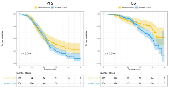 Kaplan–Meier curves assessing progression-free survival (PFS; left) and overall survival (OS; right) according to ADAM17 expression, as dichotomized around the cut-off value of H score = 50.