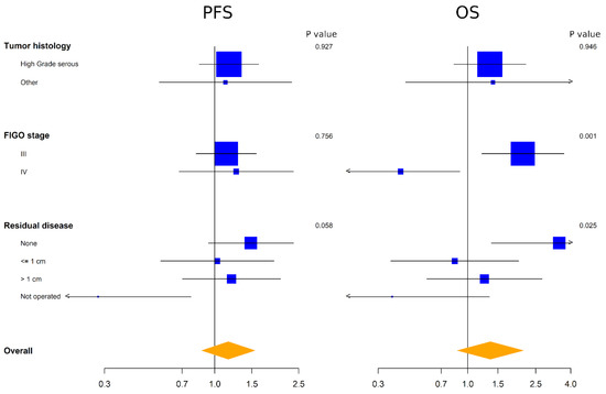 A multivariable analysis was performed using as covariates: age (as category <65 vs. ≥65), ECOG performance status (PS) (0 vs. 1–2), residual disease (None; ≤1 cm; >1 cm; not operated), FIGO stage (III vs. IV), tumor histology (high-grade serous vs. other) and ADAM17 (considered as continuous variable and as categorical variable defined by best cut-off value).