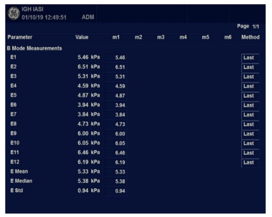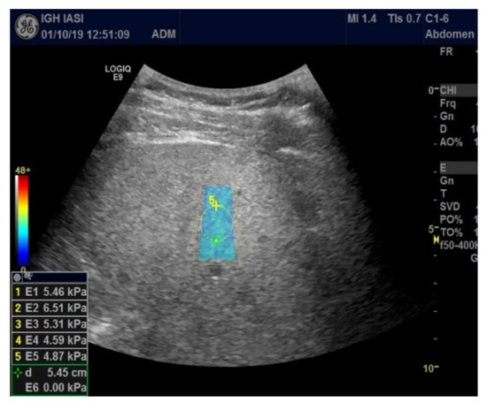 Elastometry was performed with the C1-6-D convex probe in Elasto 2D-SWE.GE mode. For liver stiffness (LS) expressed using Young’s modulus (kPa), the median value and IQR (interquartile range) were automatically calculated. The results were validated if the IQR/median ratio was less than 30%. The following cut-off values were used to qualify the grade of fibrosis: <6.6 KPa (F0–F1), 6.6–7.9 KPa (F2), 8–10 kPa (F3), >10.1 kPa (F4), values proposed by Kim et al. [12].