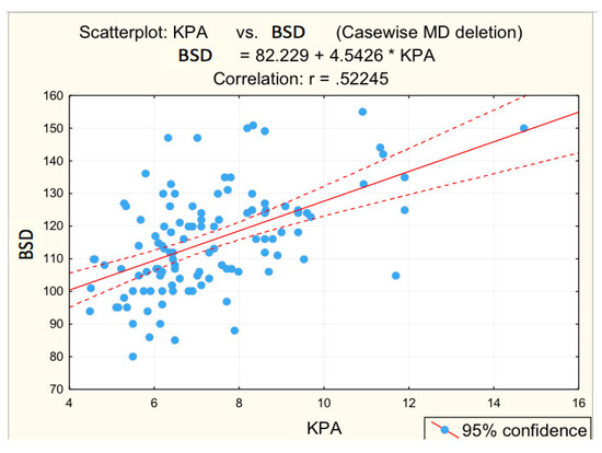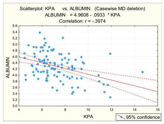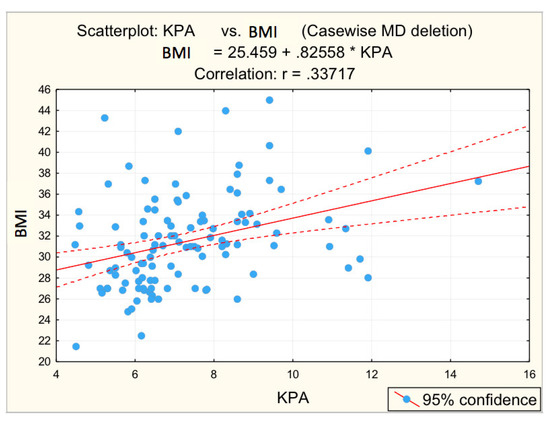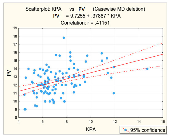 Figure 3, Figure 4, Figure 5, Figure 6 and Figure 7 suggest the correlations are statistically significant, related to correlation intensity and regression line between kPa (elastometry) and investigated variables.