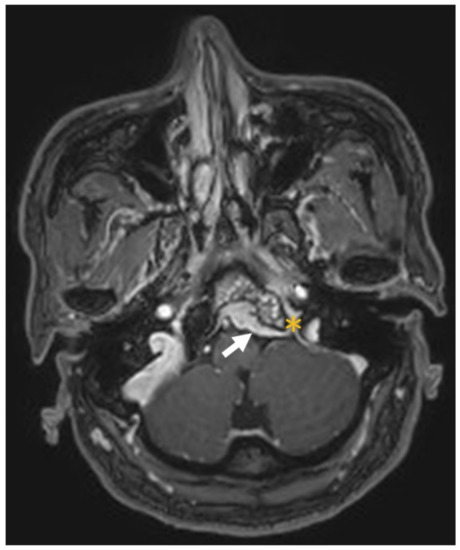 Magnetic resonance imaging of an enhanced lesion in the retropharyngeal space with encasement of the clivus bone, internal carotid artery, jugular foramen (asterisk) and hypoglossal canal (not shown). The lesion was located outside the dura mater (arrow).