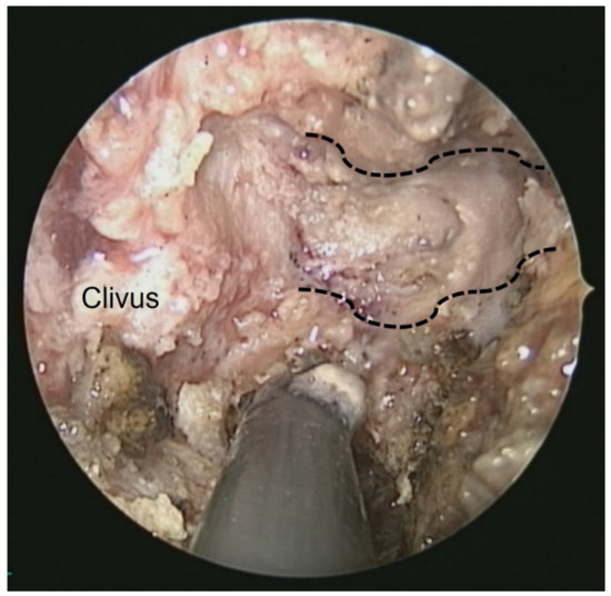 Intra-operative endoscopic view from the nose: the left side hypoglossal canal (black dashed line) and underlying lower cranial nerves were well-decompressed.