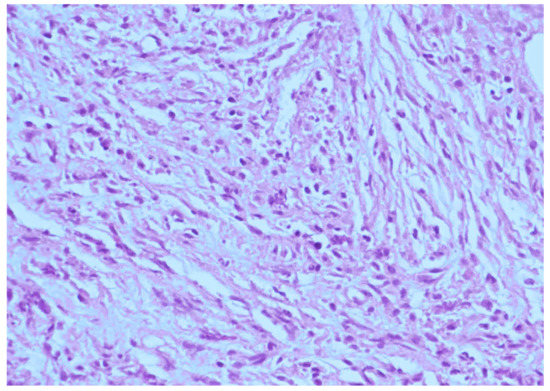 Histological section of the surgical specimen showing acute and chronic inflammatory changes, including inflammatory cells with fibrosis (hematoxylin and eosin staining, original magnification 400×). A diagnosis of an inflammatory pseudotumor (IPT) was made.