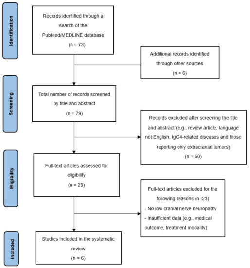 Complete surgical excision is considered to be curative for lesions located in accessible regions, such as the lungs or gastrointestinal tract [5,6,7]. Steroids or conservative treatment are favored for IPT in inaccessible regions, lesions with high morbidity, or those located at an anatomic location precluding complete resection, such as the orbit, cavernous sinus, or brain [8,9,10]. Surgical resection, steroids, radiation, or a combination of these treatments have been used for IPT of the skull base [11,12]. However, for steroid-resistant or surgically inaccessible skull base lesions, treatment is challenging and controversial, especially for patients with lower cranial nerve (LCN) palsy. This study is the first and most comprehensive systematic review of reported cases of skull base IPT. We focused on cases with LCN neuropathy, and aimed to identify trends in treatment modalities and patient outcomes in the very limited number of reported cases.