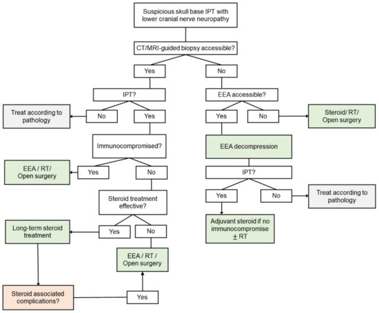 Proposed diagnostic and therapeutic algorithm for suspicious skull base IPT with lower cranial nerve neuropathy. Abbreviations: CT = computed tomography; EEA = endoscopic endonasal approach; IPT = inflammatory pseudotumor; MRI = magnetic resonance imaging; RT = radiation therapy.