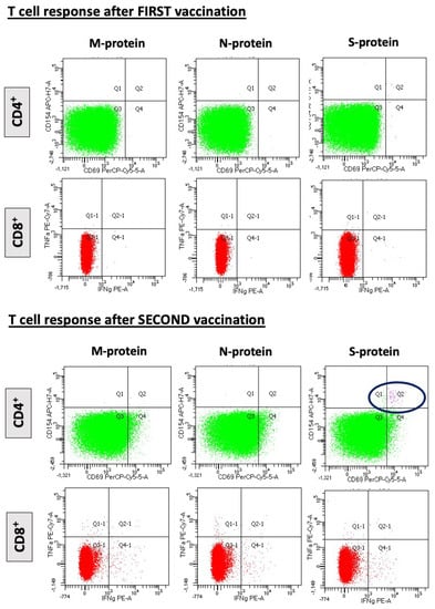 Representative example of a patient with SARS-CoV-2-reactive CD4 cells after stimulation with M-, N-, and S-protein overlapping peptide pools. Only after the second dose of BNT162b2 mRNA vaccination a CD4 cell response is observed (lower panel, blue circle). No CD8 cell response is noted after the first and second vaccine.
