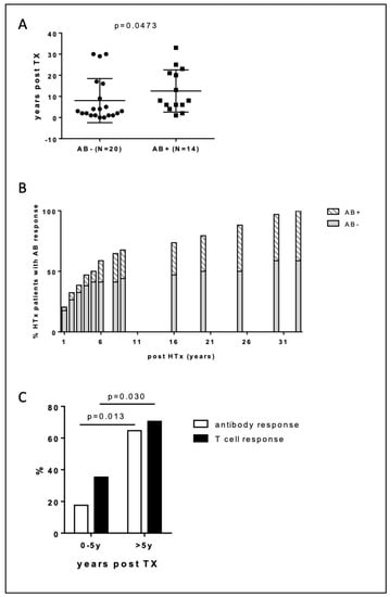Furthermore, the antibody and cellular response was related to graft age with those without antibody or T cell response being more recently transplanted (AB−/CD4+ neg vs AB+/CD4+ pos: 13 ± 10 years vs. 8 ± 10 years, p = 0.0473) (Figure 3A). The percentage of patients with positive S-IgG antibody titers was significantly higher 5 years after transplantation (65% > 5 years post-HTx vs. 18% 0–5 years post-HTx, p = 0.013) (Figure 3B). Similarly, in those transplanted > 5 years, the percentage of patients with a positive T cell response was significantly higher (35% 0–5 years post-TX vs. 71% > 5 years post-HTx, p = 0.030) (Figure 3C). Interestingly, this was associated with significantly lower tacrolimus (9.0 ± 1.4 vs. 12.2 ± 1.9 ng/mL, p < 0.001) and cyclosporine trough levels (80 ± 11 vs. 121 ± 30 mg/dL, p < 0.001) in those transplanted > 5 years vs. those transplanted < 5 years).