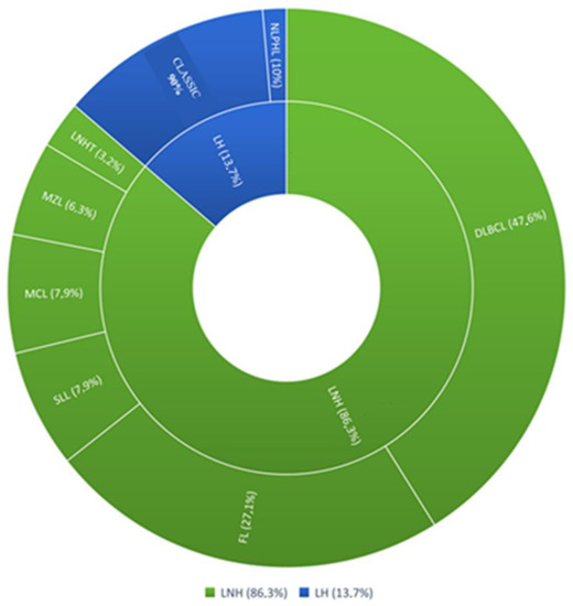The mean age of patients was 59.04 years (±14.61); 38 (52%) were male, and 35 (47%) were female. In total, 63 patients (86.3%) had a diagnosis of non-Hodgkin’s lymphoma, and 10 patients (13.7%) had a diagnosis of Hodgkin’s lymphoma. Among NHL subjects, 30 patients (41.2%) had diffuse large B-cell lymphoma (DLBCL), 17 patients (23.3%) had follicular lymphoma (FL), 5 patients (6.8%) had small lymphocyte lymphoma (SLL), 5 patients had mantle cell lymphoma (MCL), 4 patients had marginal zone lymphoma (MZL), 2 patients (2.7%) had T-cell non-Hodgkin’s lymphoma. Among Hodgkin’s lymphomas, 9 patients (12.3%) represented the classic variant (CHL), and only 1 patient presented with the nodular lymphocyte-predominant variant (NLPHL) (Figure 1).