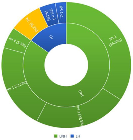 The patients, according to Ann Arbor staging, were divided into 9.58% (7 pcs) stage I; 19.17% (14 pcs) stage II; 23.28% (17 pcs) stage III; 47.94% (35 pcs) stage IV. In addition, patients were stratified according to their prognostic risk using the IPI (International Prognostic Index) score for non-Hodgkin’s lymphoma and the IPS-Hasen clever index score for Hodgkin’s lymphoma. For non-Hodgkin’s lymphomas, the breakdown was as follows: 16 patients (21.9%) had an IPS 1, 25 patients (34.3%) had an IPS 2, 17 patients (23.3%) had an IPS 3, 4 patients (5.5%) had an IPS 4. Among Hodgkin’s lymphomas, 2 patients (2.7%) had an IPS 1-2 score, 3 patients (4.1%) had an IPS ≥ 3. Six HL patients were excluded from the prognostic classification because they had stages of non-advanced disease (Figure 2).