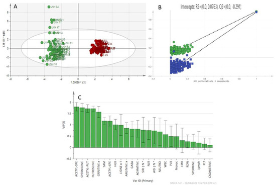 The analysis was also extended to patients with Hodgkin’s lymphoma. The group of lymphoma patients (LNH and LH) was compared with the group of healthy patients (Figure 4). The model shows a natural separation between healthy subjects and subjects with lymphomas (LNH + LH). The VIP scoring variables are shown in Figure 4C. Acetyl-spermidine, acetyl-putrescine, putrescine, spermidine, and ornithine are the discriminating variables for the groups (LNH+LH vs. Healthy). A permutation testing is shown in Figure 4B to validate the classification model. The resulting regression lines showed an R2 intercept at 0.0371 and a Q2 intercept at −0.141.