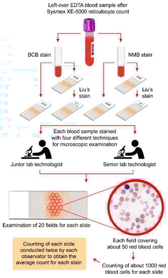 - Viana, K.A.; Martins Filho, O.A.; Dusse, L.M.S.A.; Avelar, R.S.; Avelar, D.M.V.; Carvalho, B.; Ribeiro, C.M.F.; Antonelli, L.R.D.V.; Teixeira, A.; Carvalho, M.D.G. Reticulocyte count: Comparison among methods. J. Bras. Patol. Med. Lab. 2014, 50, 339–345. [Google Scholar] [CrossRef][Green Version]