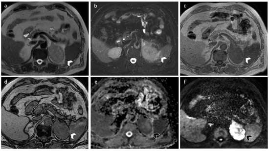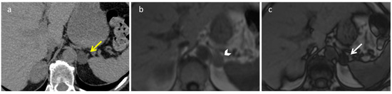 - Ream, J.M.; Gaing, B.; Mussi, T.C.; Rosenkrantz, A.B. Characterization of Adrenal Lesions at Chemical-Shift MRI: A Direct Intraindividual Comparison of in- and Opposed-Phase Imaging at 1.5 T and 3 T. AJR Am. J. Roentgenol 2015, 204, 536–541. [Google Scholar] [CrossRef]