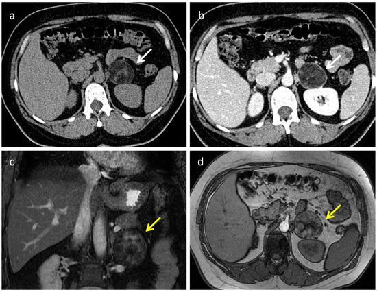 Adrenal myelolipoma in a 42-year-old woman. CT demonstrates a large mass within the left adrenal gland (white arrow in (a,b) and yellow arrows in (c,d)), characterized by well-defined borders and internal inhomogeneity. Axial unenhanced CT (a) shows attenuation values <−30 HU due to the presence of gross fat. On portal venous phase (b), the mass shows subtle enhancement due to its poor vascularization. Coronal T2 fat sat sequence (c) and axial T1-weighted out-phase image (d) demonstrate extracellular fat.