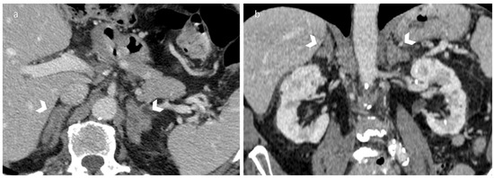 The adrenal glands are triangular-shaped organs with an inverted Y morphology, measuring circa 5 cm by 2 cm, with a weight of 4–5 g each [22,40]. The average width of the adrenal glands is between 6 and 8 mm, with a slightly greater width of the left adrenal gland [41]. Adrenal hyperplasia is a benign condition consisting in a diffuse or focal glandular enlargement; it can be congenital or acquired over the course of life (Figure 3).
