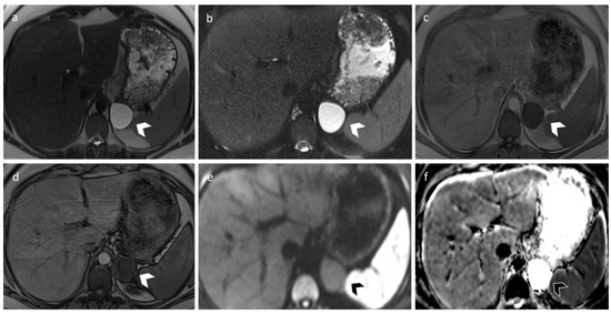 A 65-year-old female with right adrenal pheochromocytoma. MRI revealed a 5 cm solid lesion characterized by intermediate T2 signal (a,b) and no T1 signal drop in T1 out-of-phase sequences (c,d). Post-contrast acquisitions in arterial and portal venous phase (e,f) reveal inhomogeneous signal intensity and necrotic components.