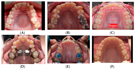 Samples of the maxillary arch images showing the variety of malocclusions, including pretreatment (A,B), during treatment (C–E), and post-treatment (F) images. To retain the aspect ratio of the original images, a black border was added to avoid side stretching to match the 480 × 320 size (A,F). The background change in the image did not affect the results. A sample of the selected rugae area is shown in (C).