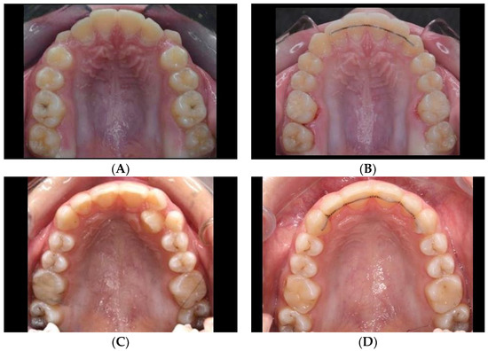 Occlusal views of the maxillary arches of treated patients with corresponding pre-treatment (left column, A,C) and post-treatment (right column, B,D) images. A total of 47 such pairs were used to test the robustness of the trained network to identify the teeth after their positions were altered through orthodontic treatment.
