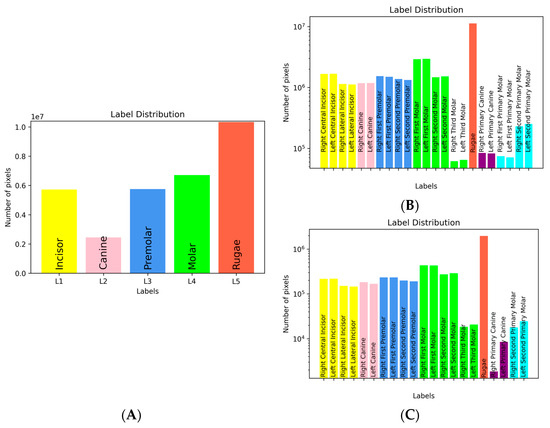 Statistics of the labeling schemes: Family of teeth labeling scheme: the rugae labels are the highest, whereas canine labels are the lowest, while those of the molars, premolars, and incisors were comparable (A); labeling scheme for individual adult teeth: the number of rugae pixels is greatest, and those associated with individual adult teeth are comparable (B); distribution of paired teeth labeling (C).