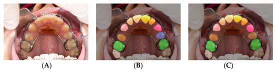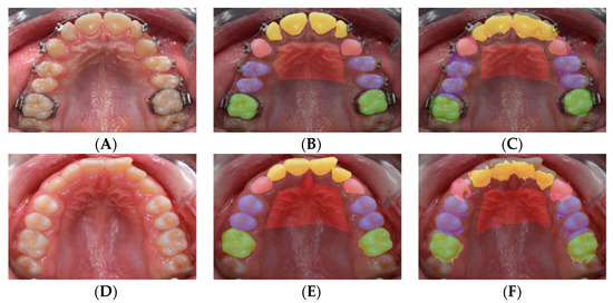 The pixel labeling was performed in a MATLAB application [10] by manually creating polygons following the contour of the regions of interest. For each image in the dataset (Figure 2A), an associated image of similar dimensions was created to identify the labels by assigning a different color to each label (Figure 2B,E). The teeth were captured upon superimposing the label on the original image (Figure 2C,F). All labels and contours of the teeth and the rugae area were verified by the labeling orthodontists.