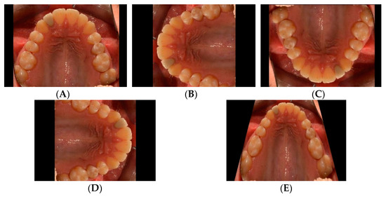 The dataset consisted of 797 photographic images compiled by the Division of Orthodontics and Dentofacial Orthopedics at the American University of Beirut Medical Center (AUBMC). In contrast to previous publications in which X-ray images were used, colored RGB two-dimensional (2D) images of the maxillary teeth and palate belonging to various malocclusions were taken according to standards at the occlusal plane with a single-lens reflex camera using an intraoral mirror. The images were taken at different distances to generate diversity in the dataset and make the training more robust. Images from the late mixed to permanent dentitions were included to illustrate the differentiation between primary canines and molars from permanent canines and molars. Also included to widen the scope of training were images with dental appliances, significant crowding, and prosthesis (including primary teeth with stainless steel crown) (Figure 1). Excluded were images with multiple missing teeth, supernumerary, and transposed teeth. The images were saved in “PNG” format and with a 480 × 320 pixel resolution because this was the common resolution for the majority of the taken images and required less memory for training compared to high resolution images.