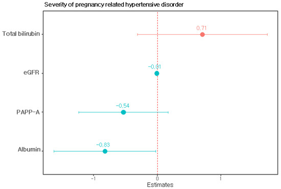 Regression coefficients of the model predicting the severity of pregnancy-related hypertensive disorders. Note: PAPP-A, pregnancy-associated plasma protein-A; eGFR, estimated glomerular filtration rate.