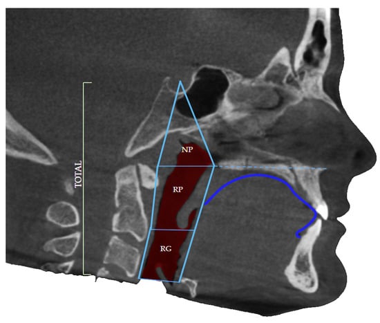 Defined borders of the airway volume consist of the nasopharyngeal (NP) portion as well as oropharyngeal regions: retropalatal (RP) and retroglossal (RG) and dorsum linguae identification.