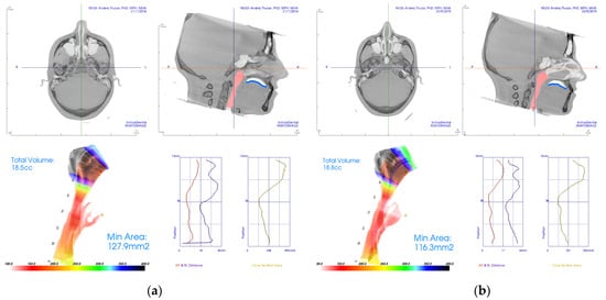 Examples of CBCT 3D analysis of the airway with evaluation of constriction in the software Invivo 6, from Anatomage (Santa Lara, CA, USA). (a) Pre-treatment CBCT with constriction; (b) post-treatment CBCT analysis with insignificantly improved airway constriction and unchanged tongue position.