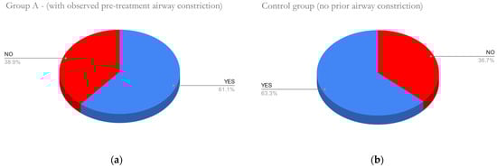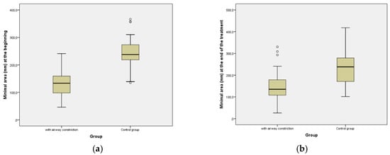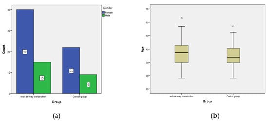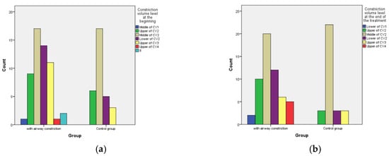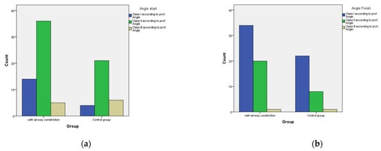 Neither initial nor final distribution of patients’ Angle Classifications was statistically significant between the groups. As Figure 6a shows, the dominant group in patients with constricted airways were patients in Class II. However, Class II patients were also dominant in the unconstricted control group After finishing CBCT, the majority in both groups were patients in the first Angle Class, although Class II persisted due to strict evaluation of molar position. This included extraction cases, unilateral Class II and non-surgical camouflage treatments in adults (Figure 6b).