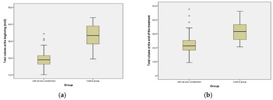 Patients who underwent clear aligner therapy experienced changes in upper airway volume. In the airway narrowing group, there was a statistically significant increase in volume during therapy (p < 0.001). The volume change in the control group without stenoses before treatment was not significant.