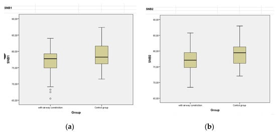 Values of SNB angle in groups A and B. The angle SNB formed by the points (1) Sella Turcica, (2) hard tissue Nasion (3) point B. (a) Pre-treatment SNB angle in group A (left) and group B (right); (b) Post-treatment SNB angle in group A (left) and group B (right).