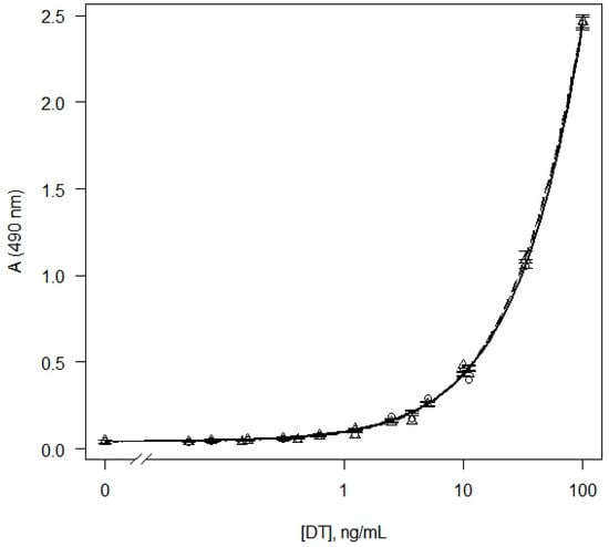Dose–response curves obtained as results of sandwich ELISA of DT in buffer (circles, solid line) and Elek broth (triangles, dashed line). Model-based standard errors are also shown.