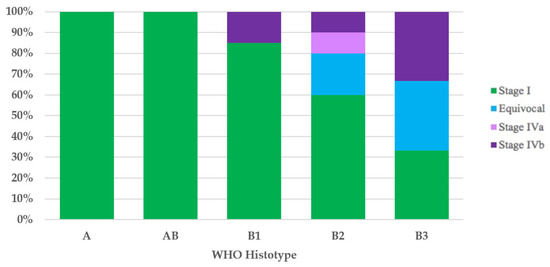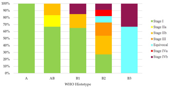 Stage distribution in thymoma histotypes according to the Masaoka–Koga staging system. WHO, World Health Organization.
