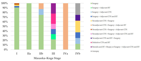 Treatment according to Masaoka–Koga stage. CTX, chemotherapy; RT, radiotherapy.