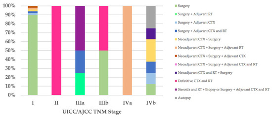 Regarding the therapeutic approach according to the UICC/AJCC TNM stage classification, of the 47 stage I patients, all T1aN0M0, 42 (89%) were treated exclusively with surgery: R0 in 39 cases, 33 (70%) of which did not have macroscopic infiltration into the thymic capsule or surrounding fatty tissue; R1 in three cases (Cases 18, 21, and 55), two of which went for further R0 surgery. Five stage I patients received neoadjuvant and/or adjuvant therapies and R0 or R1 surgery (Cases 8, 9, 13, 22, and 71). The only patient (100%) in UICC/AJCC TNM stage II, with unresectable thymoma, underwent biopsy and then definitive chemoradiotherapy (Case 79). Of the four stage IIIa patients, two (50%) were treated with steroids and radiotherapy, then deemed unresectable and underwent biopsy or R2 surgery followed by adjuvant chemoradiotherapy (Cases 77 and 78), while the other two patients underwent R2 surgery followed by adjuvant therapies (Cases 62 and 81). One of the two patients (50%) with stage IIIb was treated exclusively with R2 surgery (Case 76), while the other (50%), with unresectable thymoma, underwent biopsy and then definitive chemoradiotherapy (Case 63). The therapeutic approach according to the UICC/AJCC TNM IVa and IVb stages coincided with that observed in patients with Masaoka–Koga stages IVa and IVb (Figure 4).